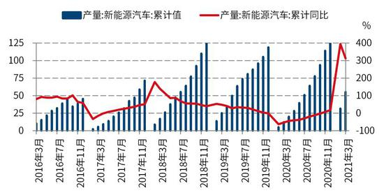 新年以来新能源汽车延续强势,硫酸镍需求量有望超预期。随着国内对新能源汽车政策扶持的加码以及国内需求的反弹,2021年前两个月国内新能源汽车销量再创新高,行业迎来确定性增长。中国汽车工业协会表示,今年第一季度,中国新能源汽车产量为53.3万辆,销量为51.5万辆,分别同比增长3.2倍和2.8倍。中国汽车工业协会副秘书长表示,2020年新能源汽车销量已经超出预期,预计达到130万辆,增幅接近8%,预计2021年增速很可能超过30%,达到180万辆。IDC亚洲(国际数据(亚洲)集团)则预计,2021-2022年得益于疫情后的车市反弹和财政补贴期限的延长,中国新能源汽车销量将实现大幅增长,2020到2025的复合增长率将达到36%。