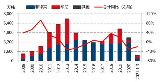 据海关总署数据,2021年3月中国镍铁进口量33.44万吨,环比增加17.81%,同比增加2.23%。其中,3月中国自印尼进口镍铁量27.78万吨,环比增加18.79%,同比减少0.94%。2021年1-3月中国镍铁进口总量97.27万吨,同比增加21.57%。其中,自印尼进口镍铁量80.10万吨,同比增加17.10%。