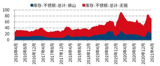 节后不锈钢再度累库程度不及预期。截至2021年4月16日,佛山、无锡两地不锈钢库存共计71万吨,较3月19日去库进8万吨。在一季度不锈钢维持较高增长的背景下,节后一个月不锈钢社会库存累库程度不及预期,一方面是在“就地过年”下,企业复工进度快于往年,此外进入2021年后海外订单持续高涨,造成下游淡季不淡的景象。进入二季度月份为终端消费旺季,同时在海外疫情仍存不确定性,国内订单丰厚的背景下,大概率将呈现稳步去库的形式。