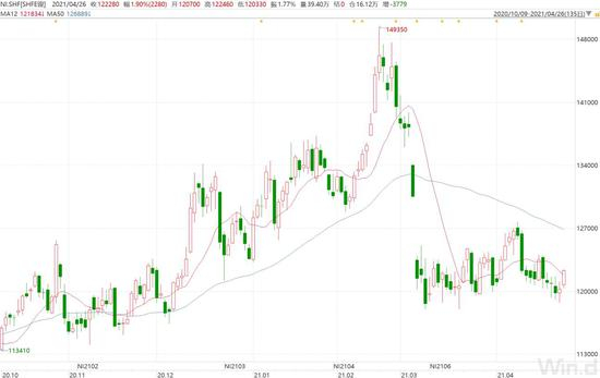 在三月初连续两个交易日下跌近15%后,沪镍就一直处于震荡盘整状态,截至2021年4月23日夜盘收盘,主力合约ni2106在四月份累计涨幅达0.99%,振幅7.46%。