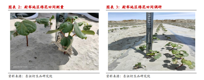 2、天气灾害:调研的这片地有补种的,补种两次,棉株生长远远落后去年同期,没有补种的老苗生长情况也不好。该农户预计单产至少要降100公斤/亩,去年风调雨顺,单产都到450-550公斤/亩了。后期若气温高,做好田间管理,作物生长进度可能能赶上,但单产下降应该一定的。今年天气灾害没有18年严重。该农户种的400-500亩地里有180亩重播,比例占到将近一半。