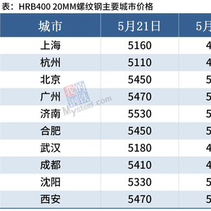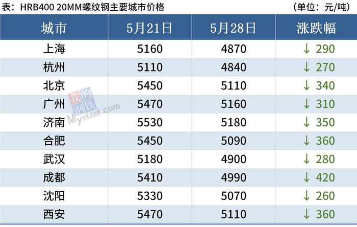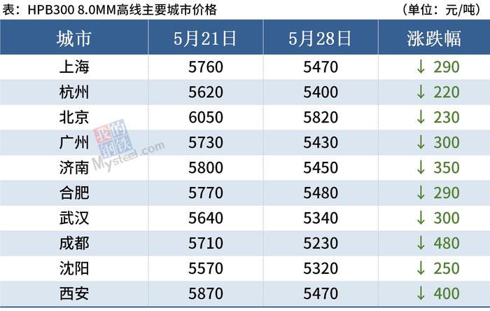 据Mysteel监测,截至5月28日,全国31个主要城市20mm三级螺纹钢均价5083元/吨,周环比下跌319元/吨;8.0mmHPB300高线均价5373元/吨,周环比下跌320元/吨。