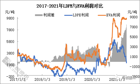 EVA/LDPE两者价差不断拉大,背后带来的是两种产品巨大的利润差。从上图可以看出,尤其19年后EVA与LDPE两者利润差迅速拉大,20年上半年阶段性回落后,21年利润差再度拉大。到目前为止,两者利润差高达7000元/吨左右。