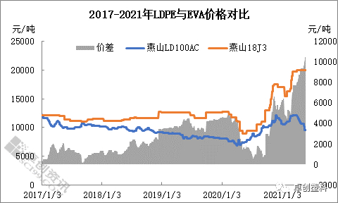 纵观近五年EVA与LDPE的价差情况,18年6月以前两者价差,基本在1500元/吨以内,但随后价差逐渐增大,截止到目前,EVA与LDPE之间价差达10450元/吨,达到近几年的高点。