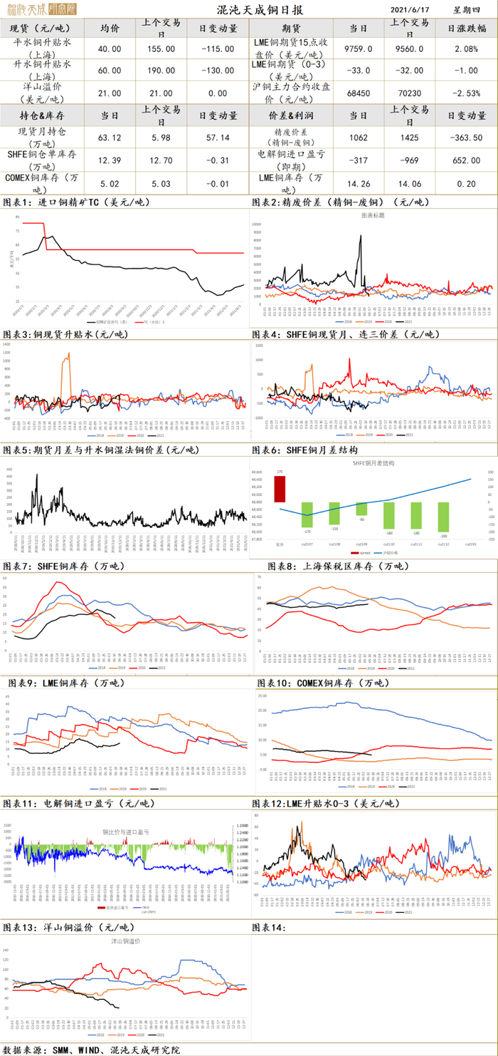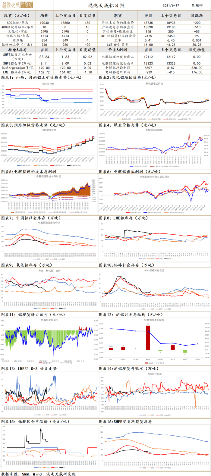 昨日宏观消息较多,接连打击,铜价大幅下挫;国储官宣抛储,白盘铜价承压猛跌,晚间美国地产数据不及预期,6月FOMC会议结束,没有加息没有taper,谈加息太早,但暗示预计2023年末之前会有两次加息,比之前预测的时间有所提前,鲍威尔表示当前更关注何时减码,对今年的经济预测和通胀预测大幅上调,一边强调通胀临时性的同时承认通胀可能持续更久且水平更高的可能性,但表态会捍卫自己的平均通胀目标,整体措辞略显鹰派,美元大幅走强,收盘比较晚的comex铜跌回反弹涨幅。