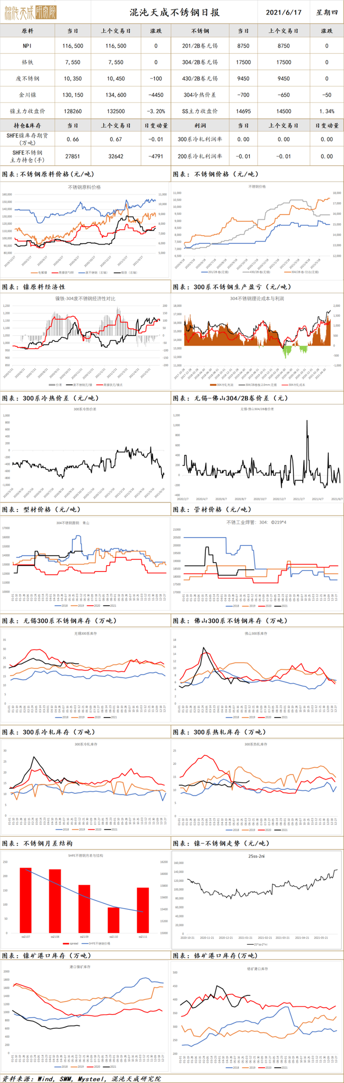 宏观上,FOMC会议结束,没有加息没有taper,谈加息太早,但暗示预计2023年末之前会有两次加息,比之前预测的时间有所提前,鲍威尔表示当前更关注何时减码,对今年的经济预测和通胀预测大幅上调,一边强调通胀临时性的同时承认通胀可能持续更久且水平更高的可能性,但表态会捍卫自己的平均通胀目标,整体措辞略显鹰派,美元大幅走强,预计对镍价形成一定压制。