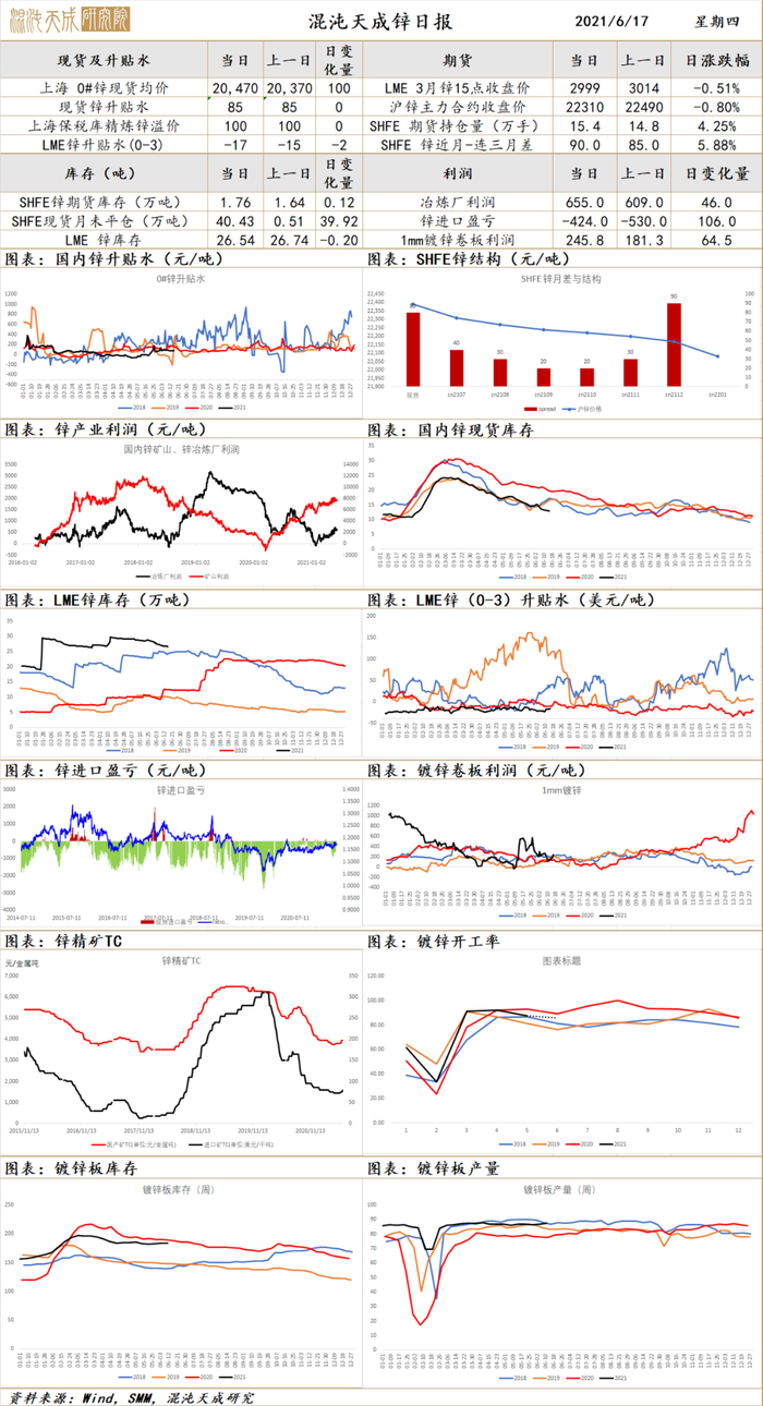 昨日国储局官方公布近期分批投放铜、铝、锌等国家储备,白盘锌价回落,由于消息提前有所消化,下跌幅度有限,夜盘又急涨收回白盘跌幅。值得注意的是夜间FOMC会议结束,没有加息没有taper,谈加息太早,但暗示预计2023年末之前会有两次加息,比之前预测的时间有所提前,鲍威尔表示当前更关注何时减码,对今年的经济预测和通胀预测大幅上调,一边强调通胀临时性的同时承认通胀可能持续更久且水平更高的可能性,但表态会捍卫自己的平均通胀目标,整体措辞略显鹰派,美元大幅走强,预计对锌价形成明显压制。