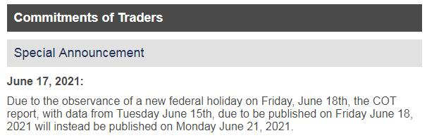 因美国新增六月节(JuneTeenth)联邦假日(6月19日),原定于6月18日(周五)发布的CFTC交易商持仓(COT)报告推迟至6月21日发布。具体发布时间为北京时间周二03:30。