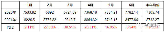 虽然2季度出现了持续下跌的行情,但2021年上半年整体价格水平高于去年同期。从月度均价来看,2021年上半年的月度均价同比均有不同幅度上涨,而半年均价涨幅也高达19.53%。虽然在扩能周期背景下,2021年上半年价格水平略高于预期,但抛开特殊因素来看,扩能对于行情压制趋势依然明显。