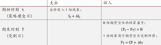 其中,为期初的现券净价,为应计利息,为现券全价;为期初期货结算价,为期末期货结算价,H为现货期货建仓比例;为期货合约期末的发票价格,其中为现券对应的转换因子,为从上一付息日至交割日的应计利息;忽略期初期货保证金占用带来的资金成本。若 ,则用1份现券交割后尚余H-1份期货合约空头,直接将多余的期货头寸平仓。若 ,则交割前需额外开仓1-H份期货合约空头,将1份现券全部交割。两种情况下的现金流是相同的。