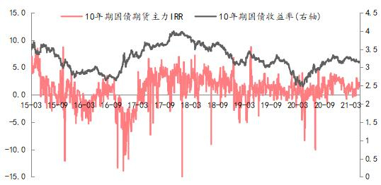 通过对历史上国债期货IRR的走势与表现进行梳理与回顾,我们可以对IRR的性质和影响因素有更直观的理解。十年期国债期货于2015年3月20日开始上市交易,首个合约为T1509合约。下图记录了自2015年3月以来十年期国债期货主力连续合约的IRR走势与十年期国债到期收益率走势的对比。