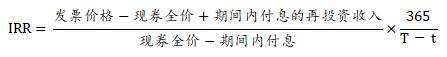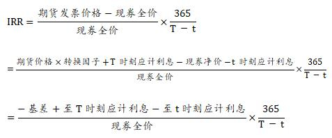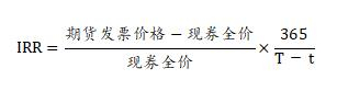 隐含回购率IRR (Implied Repo Rate)反映了以下期现套利策略的理论年化收益率:投资者买入国债现券的同时卖空相应的国债期货,持有合约至到期,并将现券用于交割。