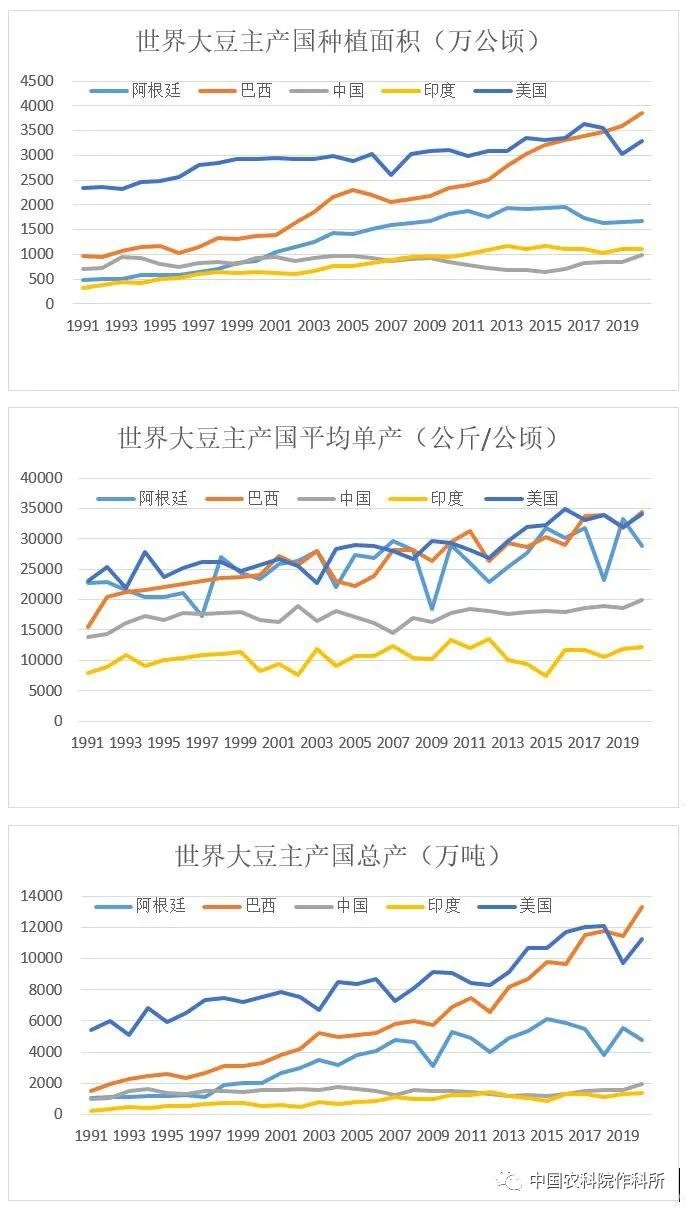 图3 世界大豆主产国大豆种植面积、单产与总产