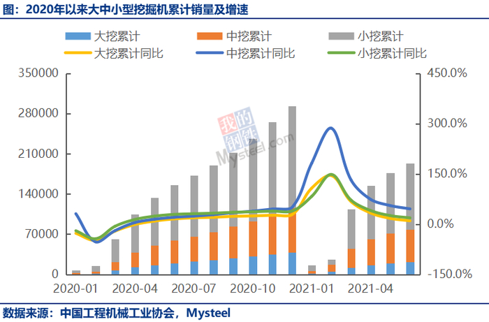 ◎ 1-6月,大中小挖国内累计销量增速分别为9.8%、45.5%、18.7%,虽然依旧保持增长态势,但分别低于前5个月销量增速7.2个百分点、9.7个百分点、6.6个百分点。大中小挖国内累计销量增速已连续3个月放缓。
