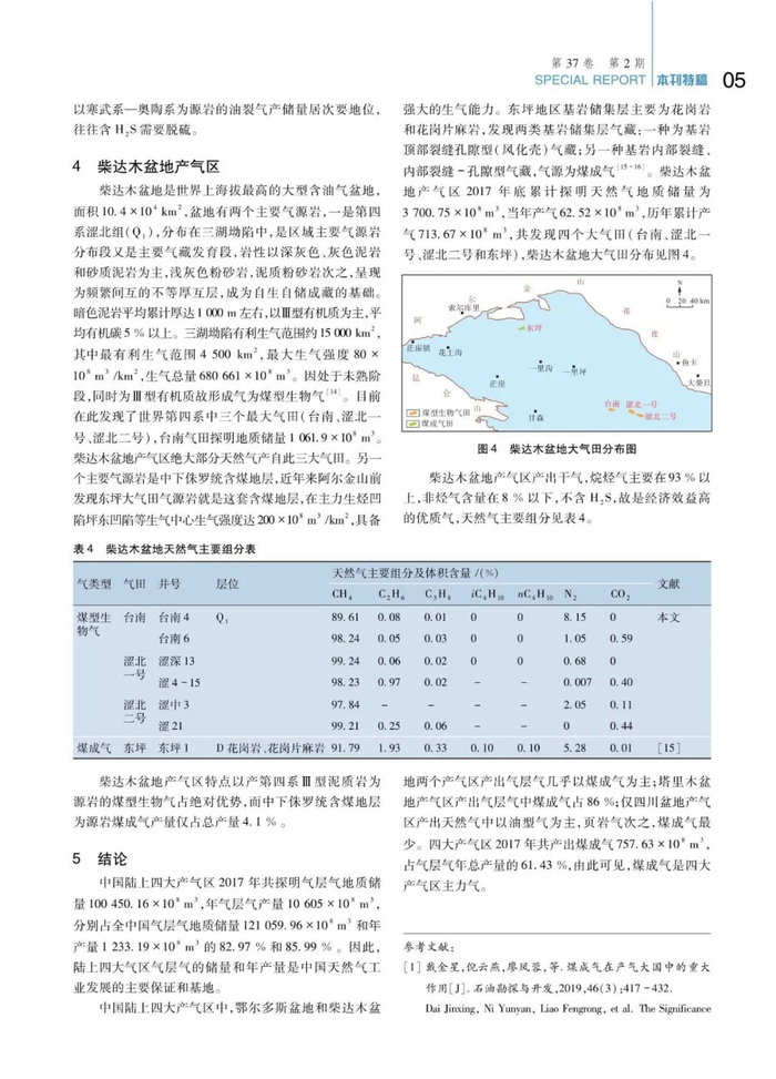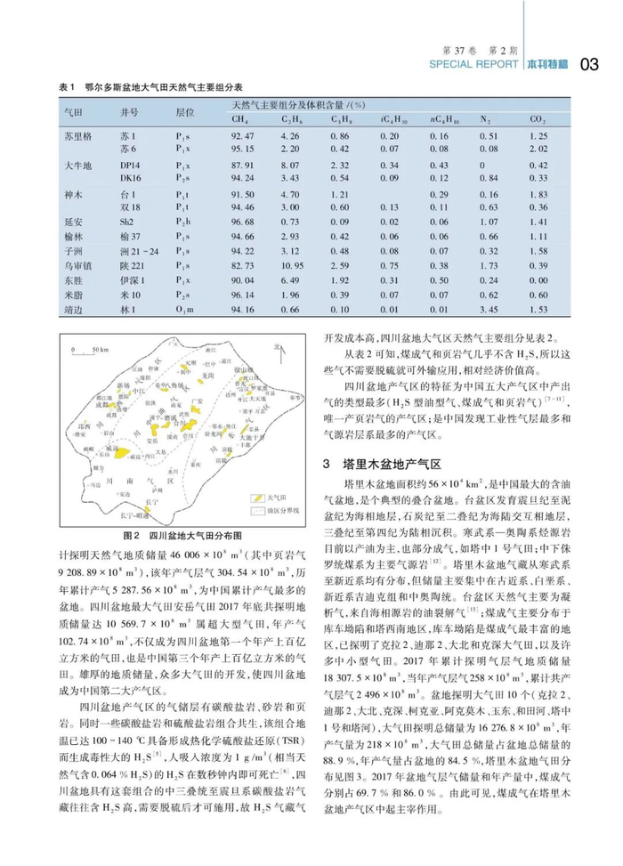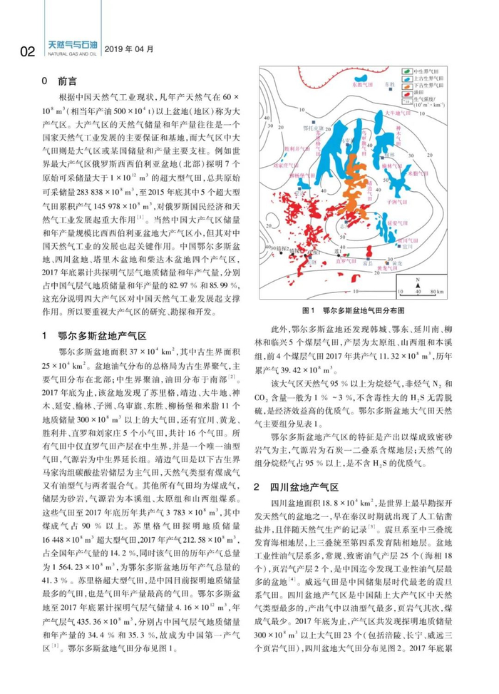摘要:凡年产天然气在60×108 m3(相当年产油500×104 t)以上盆地(地区)称为大产气区。中国陆上按年产量从大至小有鄂尔多斯盆地、四川盆地、塔里木盆地和柴达木盆地四个大产气区。鄂尔多斯盆地、塔里木盆地和柴达木盆地大产气区煤成气或煤型生物气的产量占86 以上,其气组分为烷烃气占95 以上的经济效益高的优质气;四川盆地大产气区以产含H2S油型气为主,页岩气次之,煤成气最少。四大产气区2017年底共累计探明气层气地质储量100 450×108 m3,年产量为1 060.5×108 m3,分别占全国气层气地质储量和年产量的82.97 和85.99 ,因此,四大产气区气层气的储量和年产量是中国天然气工业发展的主要保证和基地。
