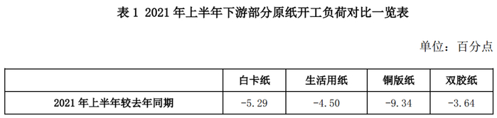 同时,由于原纸下游需求偏弱整理,终端价格传导不畅,二季度纸厂存自主减产或检修情况。据卓创资讯监测数据显示,2021年上半年下游原纸行业开工负荷率较去年同期下降3.64-9.34个百分点不等,其中铜版纸开工负荷下滑明显。