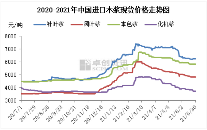 据卓创资讯监测数据显示,2021年上半年,进口木浆现货市场呈现冲高回落态势,最高点出现在3月上旬,最低点出现在6月底。进口针叶浆、阔叶浆、本色浆、化机浆现货价格高低点价差分别在1149元/吨、1202元/吨、933元/吨、1158元/吨,低价较高价下跌幅度分别在15.53%、19.91%、13.76%、23.68%。