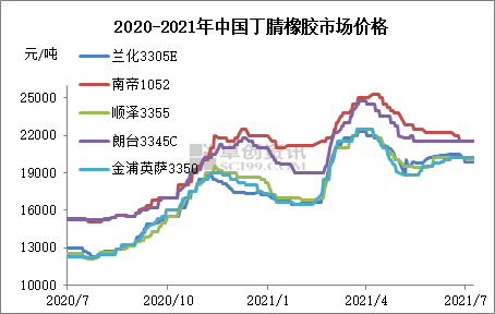 【导语】:2021年上半年,中国丁腈橡胶市场价格基准高于去年,1-6月份,以兰州石化3305E为例,丁腈橡胶市场均价在19656元/吨,同比去年增加42.15%。多受于自身基本面影响,上半年丁腈橡胶炒涨行为较浓,出现淡季不淡局面,尤其年中,原料丁二烯成本加持,支撑价格高位运行,下半年市场多根据自身行情波动。