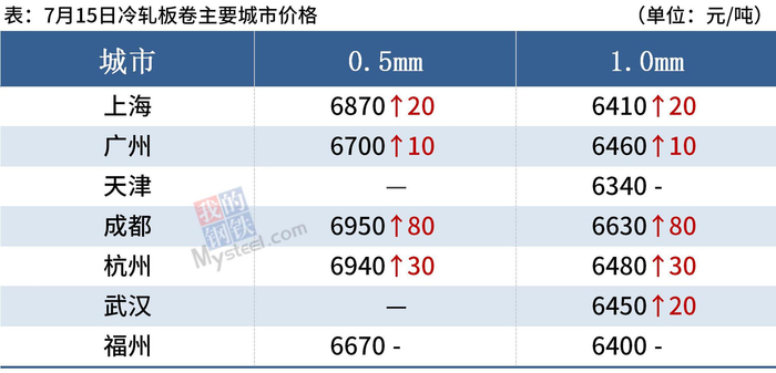 冷轧板卷:7月15日,全国24个主要城市1.0mm冷卷均价6452元/吨,较上个交易日上涨21元/吨。从供应看,近期部分钢厂开始检修,周度产量为84.33万吨,产量周环比下降0.39万吨;贸易商反馈,近期市场心态跟随电子期货走势,早盘市场心态乐观,午后电子盘期货回调,市场心态不是很好,出货明显走弱;需求方面,本周表观需求增加,周表需为87.4万吨,周环比增加3.46万吨。综合来看,16日国内冷轧价震荡调整为主。