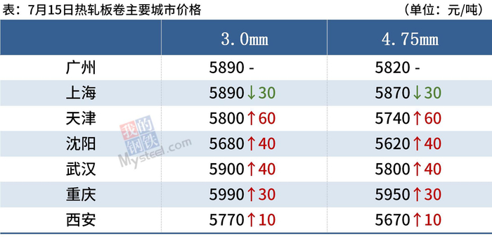 热轧板卷:7月15日,全国24个主要城市4.75mm热轧板卷均价5783元/吨,较上个交易日上涨27元/吨。现货市场心态偏弱,商家报价涨跌互现,交投市场成交氛围一般,下游需求偏弱,但由于限产减产预期较强,对于价格有一定的支撑,目前商家心态偏观望。综合来看,预计16日热轧板卷市场价格或将震荡偏强运行。