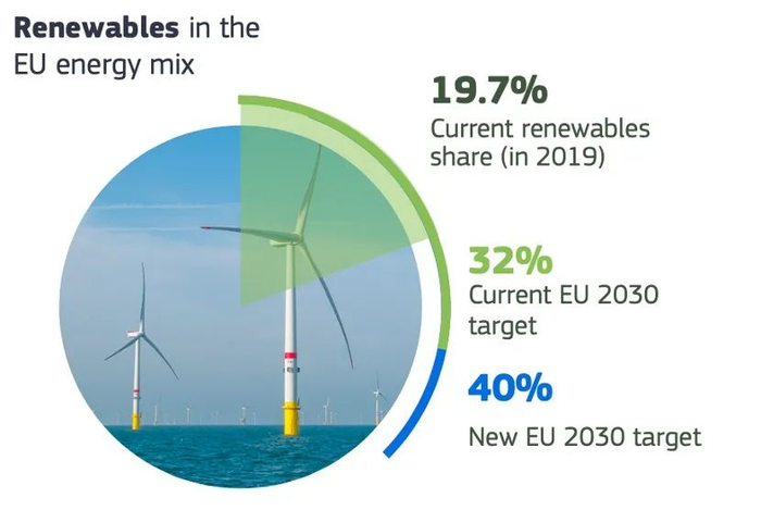 在能源结构方面,2019年,可再生能源在欧洲能源结构占比为19.7%,欧盟计划到2030年将这一比例提高到40%,相比此前32%的目标大幅提升。欧盟也为交通、取暖和制冷、建筑、工业等不同领域设立了可再生能源占比目标。