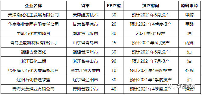 近几年中国聚丙烯产能持续快速扩张,综合计算部分2020年推迟投产装置,2021年中国地区新增产能或达到500万吨。原料来源方面,煤和丙烷持续较快发展,除此之外,新建炼化一体化项目也成为新增产能的重要一部分。从企业性质看,地方企业产能增加速度较快,将不断挤占中石化中石油的市场份额。