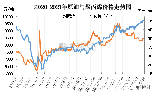 原油作为聚丙烯的重要原料来源,其价格与聚丙烯价格具有一定的相关性。2021年上半年国际油价呈现上行走势,期间虽有僵持整理以及适度回调,但整体运行稳健,价格重心逐步上移。截至2021年中,WTI油价已经站稳70美元/桶关口,布伦特油价尝试站稳75美元/桶。总体来看,原油的持续上涨,首先给予聚丙烯强劲的成本支撑。其次,利于提振现货市场参与者心态,2021年一季度市场来自原油的支撑较为强劲。但二季度来看虽原油持续涨势,但对聚丙烯提振力度减弱,两者价格走势出现背离,主因,供需格局的变化对聚丙烯影响力度较强。但综合来看,虽短期,聚丙烯来自原油的提振力度有所弱化,但从长时间来看,原油的上涨给予聚丙烯成本面的支撑力度仍是不容忽视的。