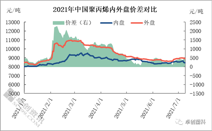 具体来看上半年行情,基本分为两个阶段——春节后至3月中旬附近的连续上涨,然后进入4月之后的震荡下跌。聚丙烯上半年的上涨,首先是因为供应端增量不及预期,但是更重要的推动力在于需求,需求端的策动。虽然节后石化惯性累库,但94万吨的累库远低于业者预期,而且2021年一季度新装置投产除去东明石化30万吨/年聚丙烯装置如期投产之外,并无新增装置落地释放(龙油装置虽然投产,但1季度生产不太正常)。而2月下旬受美国寒潮天气的影响,当地多套海外装置停车,美国75%的炼厂生产受到影响,使得本就紧张的海外供应雪上加霜,出口窗口打开且量能大幅增加给予市场较强支撑。同时响应就地过年政策,部分BOPP、无纺布等企业春节假期缩短或直接不停工,节后补货需求亦很好的助力了行情的持续上涨。3月中旬以后,PP价格开始高位回落。随着国内新装置的投产,市场供应逐步充裕,且原料价格高位致使下游工厂利润受损,企业采购意愿下降,同时出口市场逐步降温,加之国家多次强调要抑制国内大宗商品价格上涨,PP价格逐步回落。4月底-5月份中上旬,虽然装置集中检修、原油持续上涨叠加期货涨势放大给予市场一定支撑,但5月份之后,南方高温导致当地用电紧张,下游工厂停工或者降负,需求减弱,PP市场价格持续下跌。近两日,虽下游工厂在利润修复下陆续补库带动市场小幅反弹,但中期预期依然偏弱。