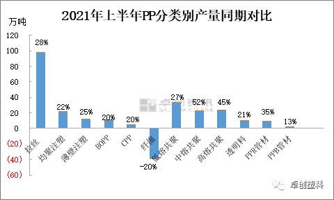 受新增产能持续扩增影响,2021年上半年聚丙烯产量较去年同期增长明显,供应结构也发生明显变化。分品种来看,除纤维料外,其他品种上半年产量较去年同期均有不同程度的增长。其中拉丝增量最为明显,2021年上半年PP拉丝产量较去年同期增加98万吨左右,增幅在28.29%左右。主因,首先需求带动,相比来看今年一季度尤其春节过后下游塑编企业节后开工时间以及开工水平明显高于去年同期水平。其次,新增产能释放,2020到2021年新增产能较多,新装置上马多以生产拉丝为主,再度导致了拉丝产量同比的大幅增加。这实际上也为行情的先涨后跌提供依据。