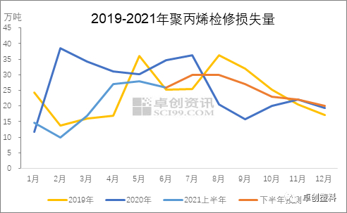 2021年1-6月份国内PP装置检修损失量在122万吨左右,同比去年减少32%,检修量上看,较去年减少较为明显。从变化趋势来看,今年从4月份开始涉及检修的国内PP装置数量明显增多,逐渐进入检修旺季。下半年来说,按照往年的检修情况,预计2021年下半年,国内PP装置的检修损失量会有一个先上升,后下降的过程。