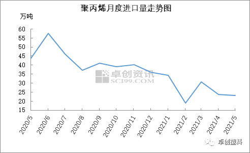 2021年1-5月,我国初级形状聚丙烯(税则号:39021000)进口总数量约为130.88万吨,总量同比缩减近16.17%,整体进口货源缩量明显。