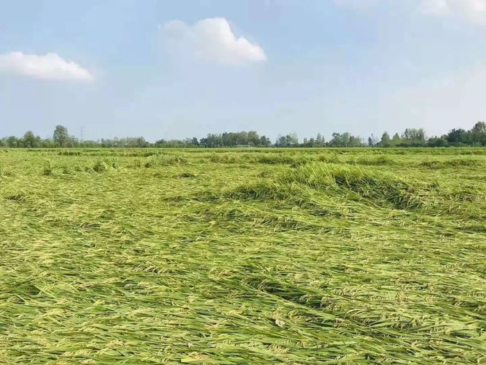 1、暴风雨影响,吹倒稻苗,因叠压效应而倒伏。