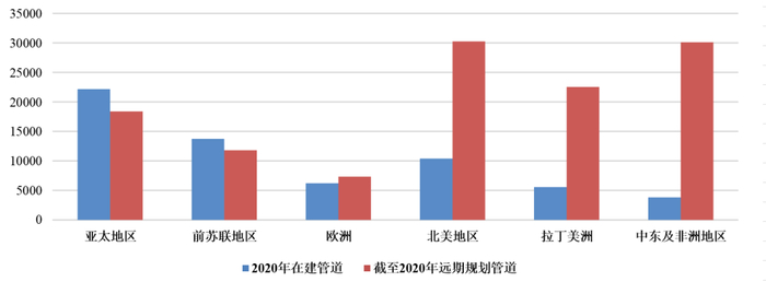 全球主要地区在建及远期规划管道里程分布图(单位km)