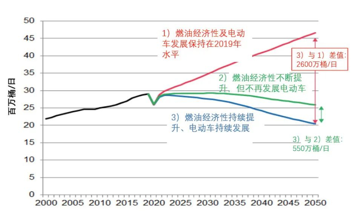为实现“碳中和”目标,现阶段推行的政策主要是提高车辆燃油经济性及排放标准、加速塑料的回收和再利用、大量开发及使用生物燃料等替代能源等。在对全球轻型车石油需求做的三种情景预测中,(1)维持2019年燃油经济性及电动车发展情况;(2)不断提升燃油经济性,但不再发展电动车;(3)持续提升燃油经济性及发展电动车。预计到2050年,“情景三”较“情景一”全球轻型车石油需求量将大幅减少2600万桶/日;较“情景二”减少550万桶/日。数据表明,仅靠不断提高燃油经济性,30年后全球轻型车的石油需求将减少2050万桶/日;仅靠发展电动车将减少550万桶/日的石油需求。