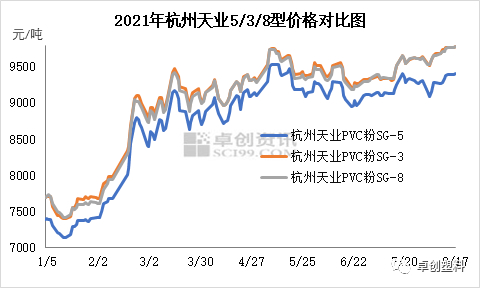 由上图可以明显看出,进入三季度3/8型与5型价差逐步扩大,尤其进入8月份,价差扩大更为明显。以天业货源为例,目前华东市场上3/8型与5型价差在400元/吨左右,并且货源一直处于紧张状态,市场现货较少,贸易商预售为主或少量到货但直接交付前期订单,市场上流通的货源并不多。下面主要对3/8型与5型价差扩大的原因进行分析。
