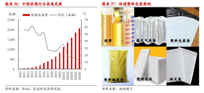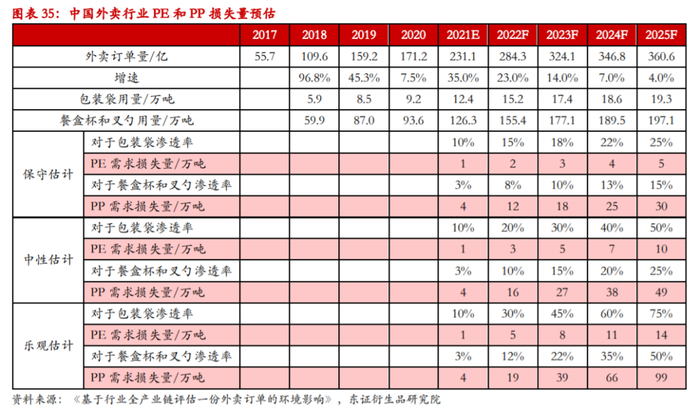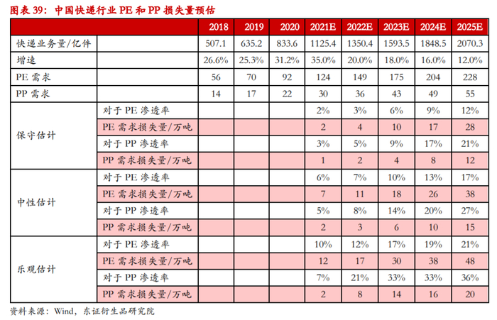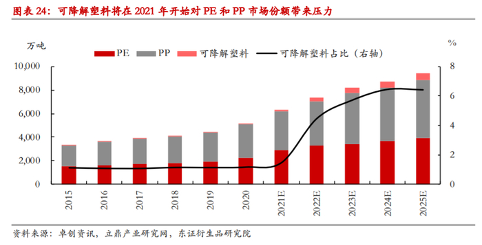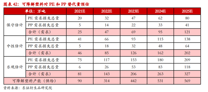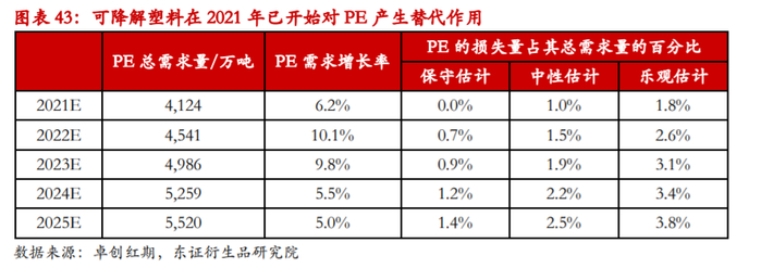 因发改委明确规定2020年底重点城市的外卖服务禁止使用不可降解塑料袋,且大部分外卖订单中额外收取了打包费用,但考虑到无纺布和纸等材料的应用,在中性估计下,我们认为到2025年可降解塑料将在打包袋中对PE造成50%的减量。