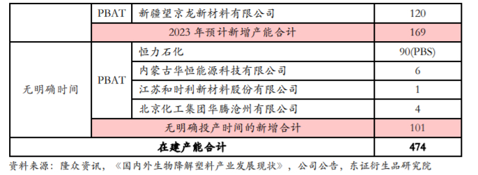 在发改委的禁塑令和2021年初PBAT的高利润刺激下,截止至2021年7月,中国PBAT、PBS和PLA涉及产能已经达到1,240万吨,目前已投产57.6万吨,在建产能474万吨,拟建产能709万吨。其中在建和拟建产能中,PBAT/PBS因技术门槛相对较低,共有984万吨;PLA有199万吨。