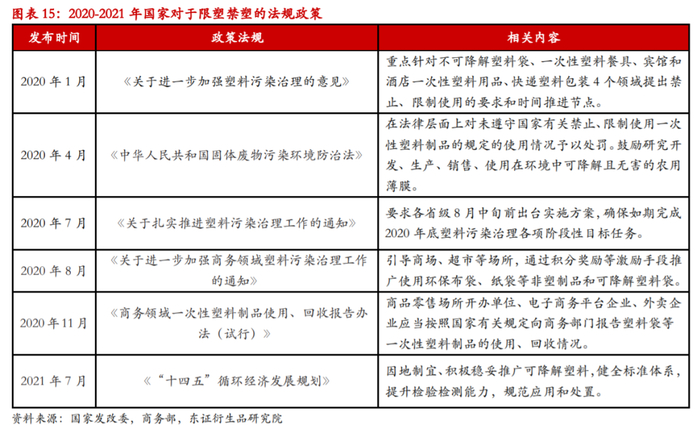 从上述一系列政策和法规中可以看出,中央对塑料污染治理方面指向性和系统性非常明显。可降解塑料在部分领域逐渐替代PE和PP将得到政策的加持。