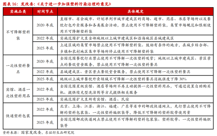 而餐盒和餐具直接接触食物,卫生标准要求高,并且发改委要求在2025年,地级以上城市餐饮外卖领域不可降解一次性塑料餐具消耗强度下降30%,则根据部分省市政策加码的情况以及我国城市人口比例,我们认为到2025年可降解塑料在餐盒和餐具中的渗透率为25%,则到2022年和2025对应的PE需求损失量为3和10万吨,PP需求损失量为16和49万吨。