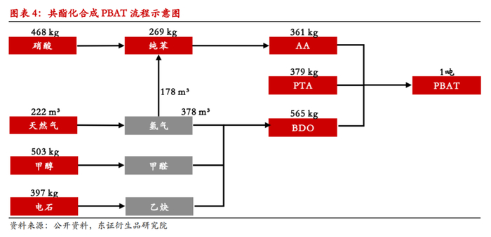 PBAT和PBS的技术门槛低于PLA,所用设备较为简单,可用PBT装置进行改造,其产能扩张速度最快。PBAT是以1,4-丁二醇(BDO)、己二酸(AA)和对苯二甲酸(PTA)为原料,通过直接酯化或酯交换法而制得。PBS是由丁二酸(SA)与1,4-丁二醇缩聚而成,工艺流程与PBAT类似。部分装置中PBAT和PBS可以转产,本文成本计算以PBAT为例。