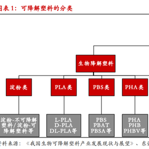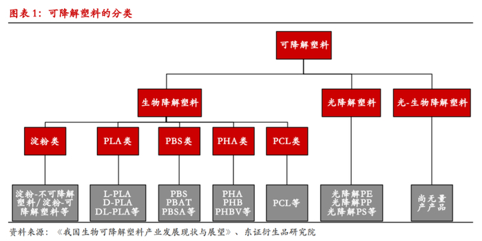 生物降解塑料是指在自然界中的微生物的作用下通过生物代谢过程而发生降解的高分子材料,最终产物为二氧化碳、水和其他对环境无害的小分子物质,是市场份额最高的可降解塑料。目前生物可降解塑料根据原料来源可分为生物基和石化基两类。生物基可降解塑料主要包括聚乳酸(PLA)、聚羟基脂肪酸酯类聚合物(PHA)和淀粉类等;石化基可降解塑料包括二元酸二元醇共聚酯系列[聚丁二酸丁二醇酯(PBS)、聚己二酸-对苯二甲酸丁二醇酯(PBAT)]和聚己内酯(PCL)等。