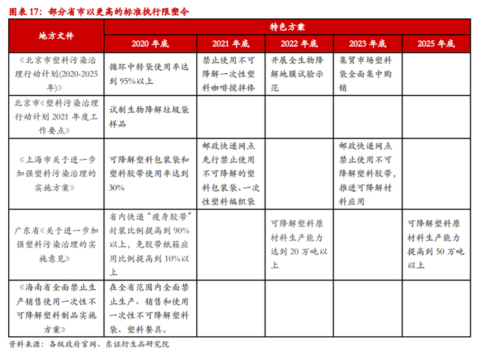 3.2、部分省市提高执行标准,可降解塑料有望提前落地