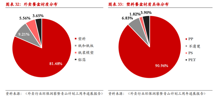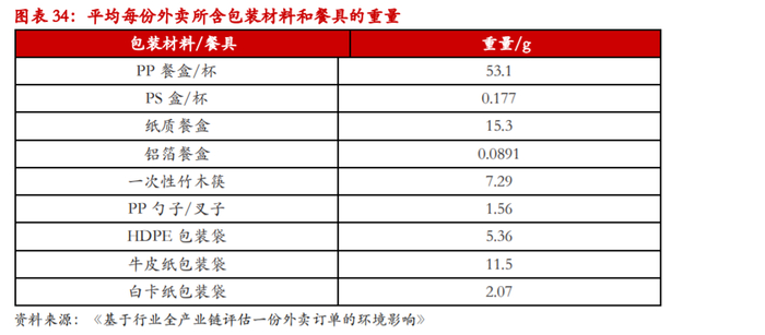 对于餐盒而言,超过80%的餐盒为塑料餐盒,其中超过90%的塑料餐盒为聚丙烯(薄壁注塑PP)材质,每个餐盒重量约25g,平均每份外卖含有两个餐盒;对于餐具而言,约78%的餐具及餐具包属于含塑料餐具,塑料勺叉平均重量1.5~2g左右,以PP材质为主;打包袋的材质分布也类似,超过80%的材质为HDPE塑料袋,其次为纸袋、无纺布袋及其他材质,塑料袋的平均重量在5.36g。部分商家随单配送PE手套、桌布等,由于占比极小未纳入计算。