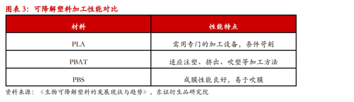 从加工性能上看,PBS和PBAT的加工可以使用加工PE和PP的设备,可通过注塑、吹塑或挤出的方式成形。PLA熔体强度低,吹膜加工性差,但与韧性好的PBAT共混时,其可在提高吹膜加工性的同时又不损害其可生物降解性。