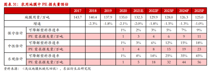 中性估计下,假设政府对可降解地膜的补贴持续到2022年结束,2023年可降解地膜的技术随着研发的投入变得成熟,我们预计可降解塑料在地膜中的渗透率在2022年时为6%,2025年为18%,对应的PE损失量为8和23万吨。若可降解塑料在巨大产能压力下加速渗透地膜领域,在乐观估计下,2022年和2025对应的PE损失量为32和56万吨。