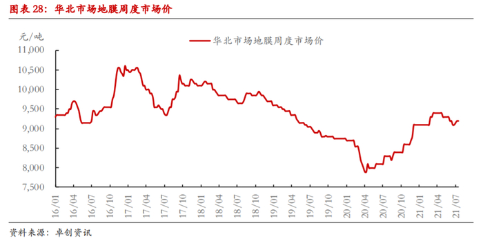 若走可降解地膜路线,目前PBAT原料价格约为22,000元/吨,假设当市场成熟后,可降解地膜加工费为1,000元/吨,PBAT地膜理论成本应在23元/公斤。但根据2020年的调研显示,对于有使用生物降解地膜意愿的农户而言,愿意给出的支付价格平均仅为13.7元/公,二者过大的价差将降低农户使用可降解地膜的意愿。