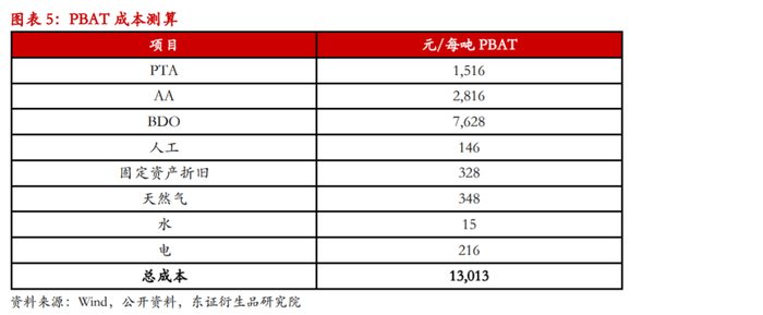 从东华天业的环评文件的物料平衡表中可得出,生产一吨PBAT分别需要PTA、AA和BDO0.379、0.361和0.565吨,若这三种原料都以外采为来源,其两年间均价分别为4,000、7,800和13,500元/吨。加上人工、固定资产折旧和三费,则PBAT的不含税成本为13,013元/吨。