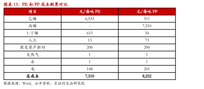 PE和PP生产工艺较为成熟,人工、固定资产折旧和三费(水、电和天然气)成本相对于PBAT和PLA低很多。若所有原料都按照外采价格计算,总成本也仅分别为7,510和8,252元/吨,相比于PBAT和PLA成本低60~70%。