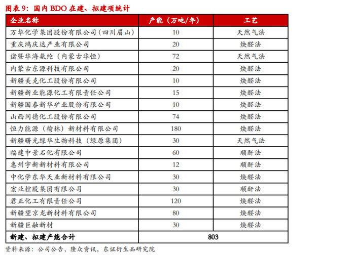 目前国内在建、拟建BDO产能为803万吨,多为PBAT产业链的上下配套,若全部投产,可支撑约1,420万吨的PBAT的需求。但PBAT建设周期约为6~8个月,BDO建设周期约为18个月,二者建设周期的差异将使得BDO在2023年前供应偏紧,到2023年后供需将达到平衡,2024年后可能再度陷入过剩。