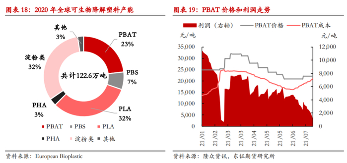 目前淀粉类降解塑料属于第一代降解塑料,占全球可降解塑料的32%的产能,由于其被证明不能完全降解以及印刷性和耐用性等方面仍然存在问题,不属于未来发展的主流。而PCL尚未实现产业化,PHA生产技术不成熟且成本过高,目前主要应用在医学领域。目前全球市场上生物降解塑料产业化程度较高并占市场份额较大的是PBAT、PBS和PLA。